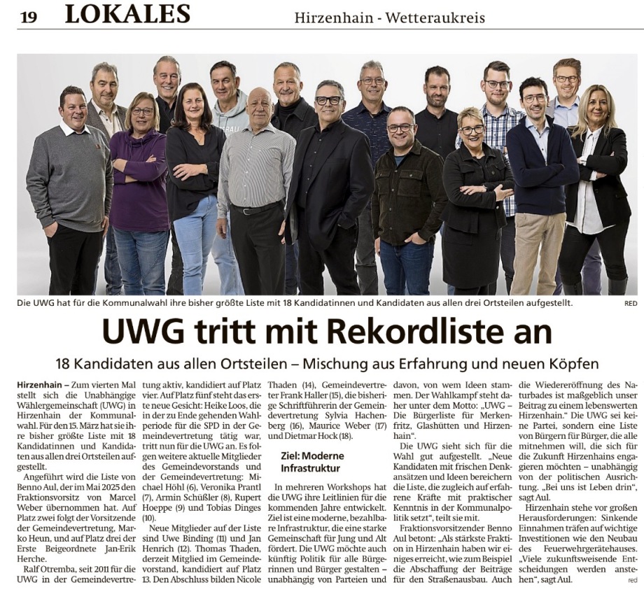 Zur bevorstehenden Kommunalwahl tritt die unabhängige Wählergemeinschaft (UWG) in Hirzenhain bereits zum vierten Mal an. Mit 18 Kandidatinnen und Kandidaten aus allen drei Ortsteilen der Gemeinde präsentiert sie ihre bisher größte Liste. Besonders freut sich darüber Benno Aul, der seit Mai 2025 den Fraktionsvorsitz von Marcel Weber übernommen hat und die Liste auf Platz eins anführen wird. Gefolgt wird er vom Vorsitzenden der Gemeindevertretung, Marko Heun, auf Platz zwei sowie vom ersten Beigeordneten, Jan-Erik Herche, auf Platz drei.